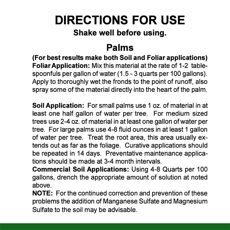 - Corrects and prevents deficiencies that may cause yellowing, browning, curling & permanent injury in palms